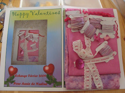 En direct de Belgique , voilà le kit de survie que j'ai reçu pour l'échange proposé par qui ? par MISSFIL bien sur... Nous avions le choix entre deux couleurs le rouge ou le rose... Et moi , j'ai reçu du rose, couleur assez inhabituelle pour moi... J'ai déjà plein d'idées pour utiliser tout cela... Encore mille mercis à Nadine...