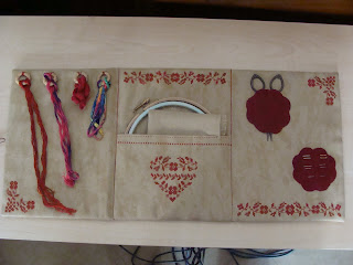 Voilà la partie intérieure de la trousse de brodeuse de chez Zoé ... Les anneaux à fil sont du raphia que j'ai tourné sur mon pouce gauche et ensuite j'ai passé les anneaux au vernis colle avant de les fixer ... Dans la partie droite , il y a un porte-aiguille en feutrine ,rembourré avec du molleton... Il y a aussi un porte-ciseaux... L a poche centrale est doublée de tissu ainsi que le porte-ciseaux... Il me reste à assembler les deux parties de la trousse...