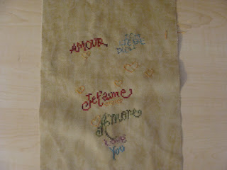 Comme je vous l'avais dit dans un précédent message, je fais le sal " l'amour tous en coeur de chez Madymade et je le brode avec les fils de Morphée d'Annick Abrial.. Nous avons 2 étapes par semaine, le lundi et le jeudi ... Là, vous pouvez voir celle de jeudi dernier et celle d'aujourd'hui...Coloris "Lune de miel" pour les coeurs et "Douce Pensée" pour le mot Love... Je mettrais la photo des 2 prochaines étapes lundi prochain...